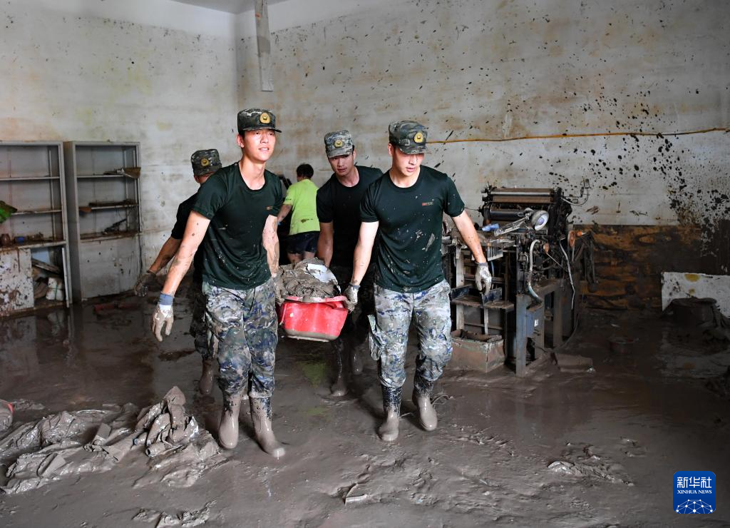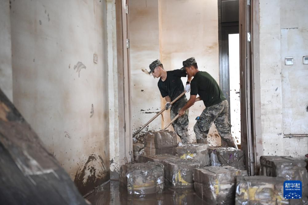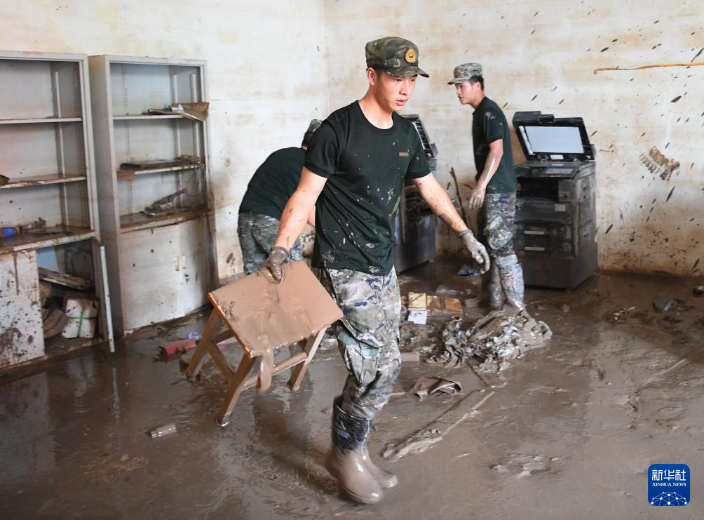 8月10日,武警河北总队保定支队战士在涿州中学教学楼清理物品。