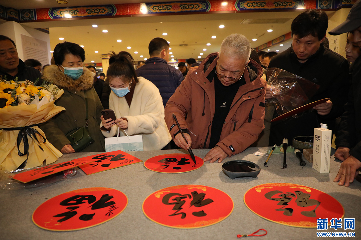 出席展览活动的嘉宾为观众写福字、送祝福。新华网 王立鹏摄