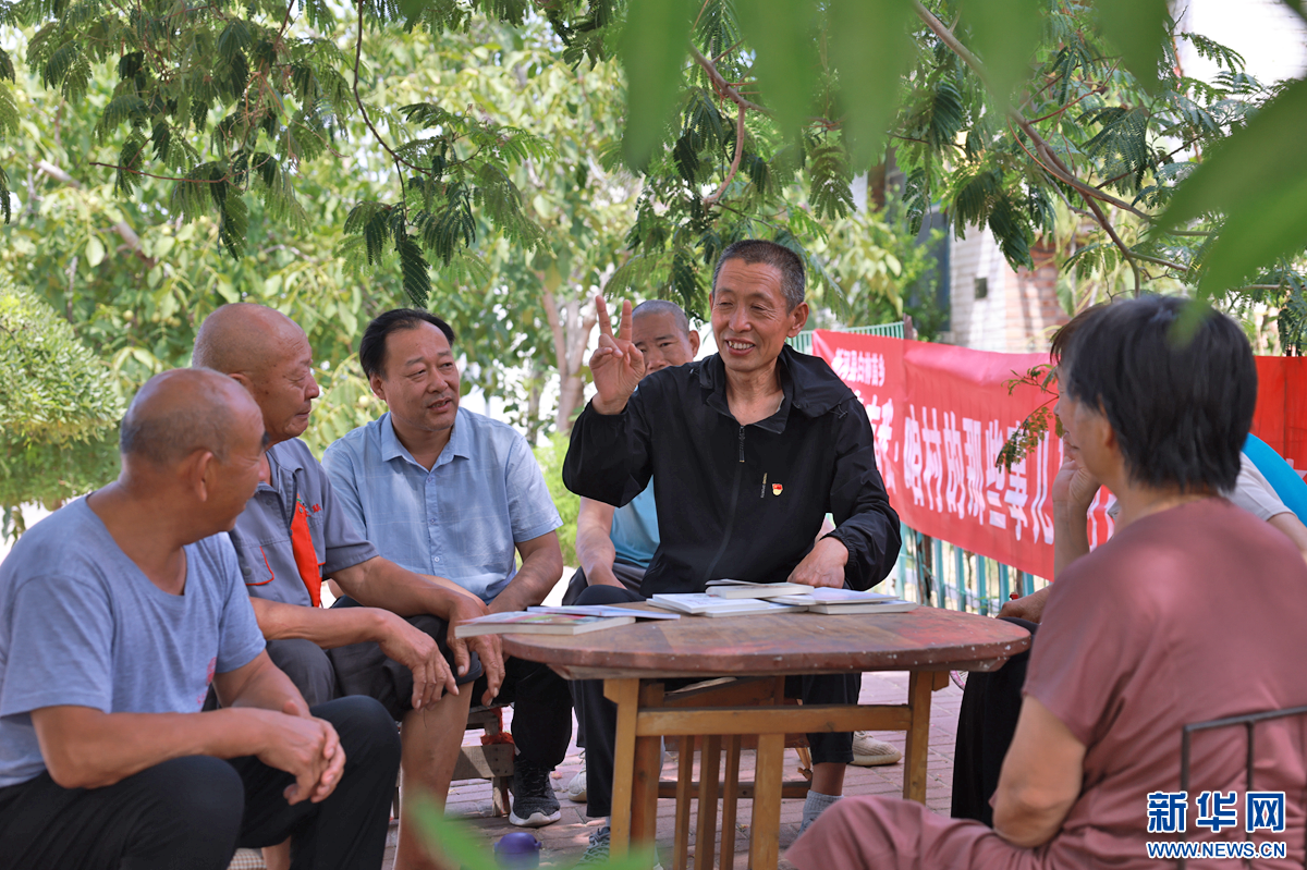 新河县白神首乡付兴庄村老党员为村民讲述勤俭节约的故事。新华网发 李世强 摄