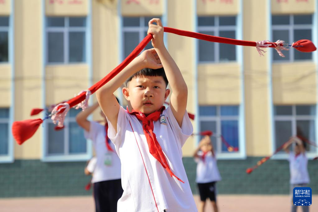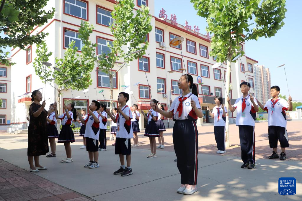 6月15日,在河北省沧州市吴桥县运河小学,学生练习传统杂技水流星。