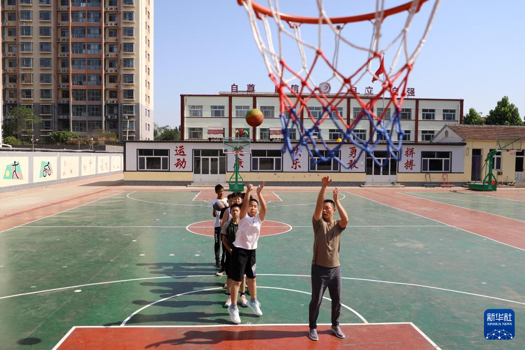 6月15日,在河北省沧州市吴桥县新兴路小学,老师指导学生投篮。