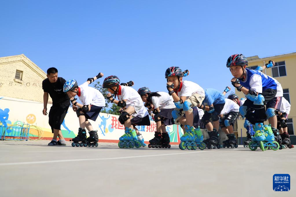 6月15日,在河北省沧州市吴桥县运河小学,老师指导学生练习轮滑。