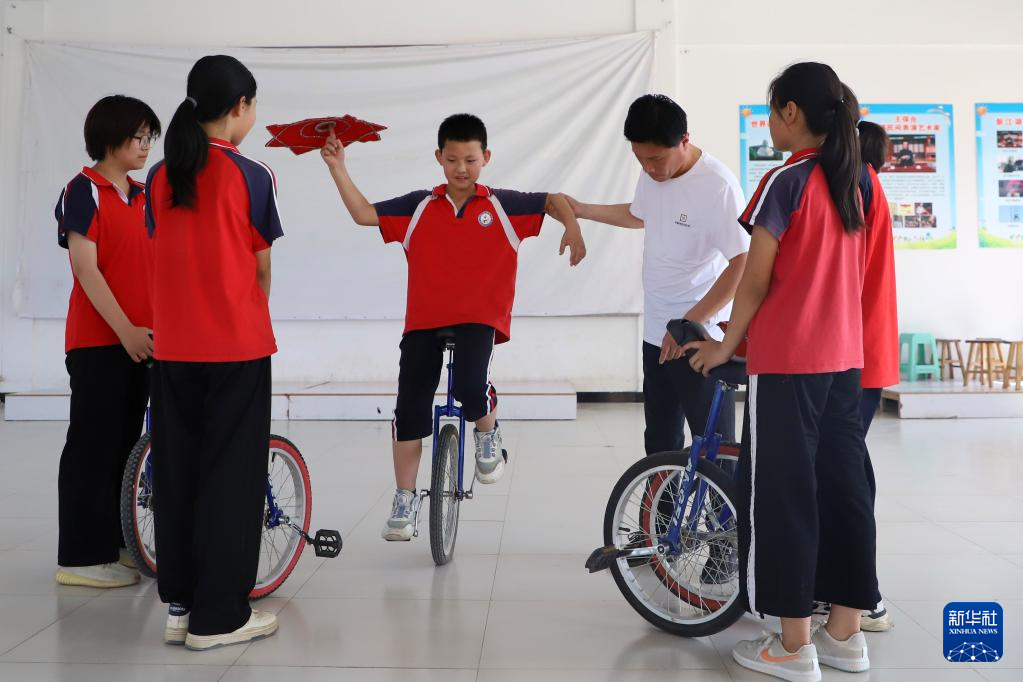 6月15日,在河北省沧州市吴桥县马库吏小学,老师指导学生练习杂技独轮车。