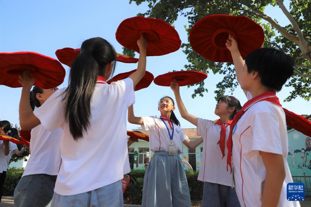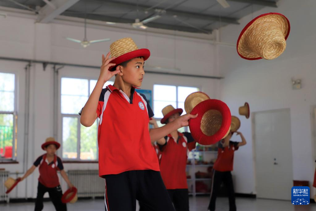 6月15日,在河北省沧州市吴桥县马库吏小学,学生练习杂技杂耍草帽。