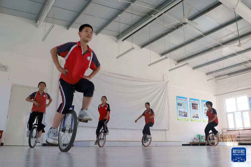 6月15日,在河北省沧州市吴桥县马库吏小学,学生练习杂技独轮车。