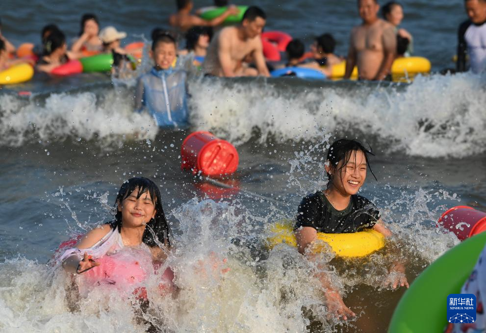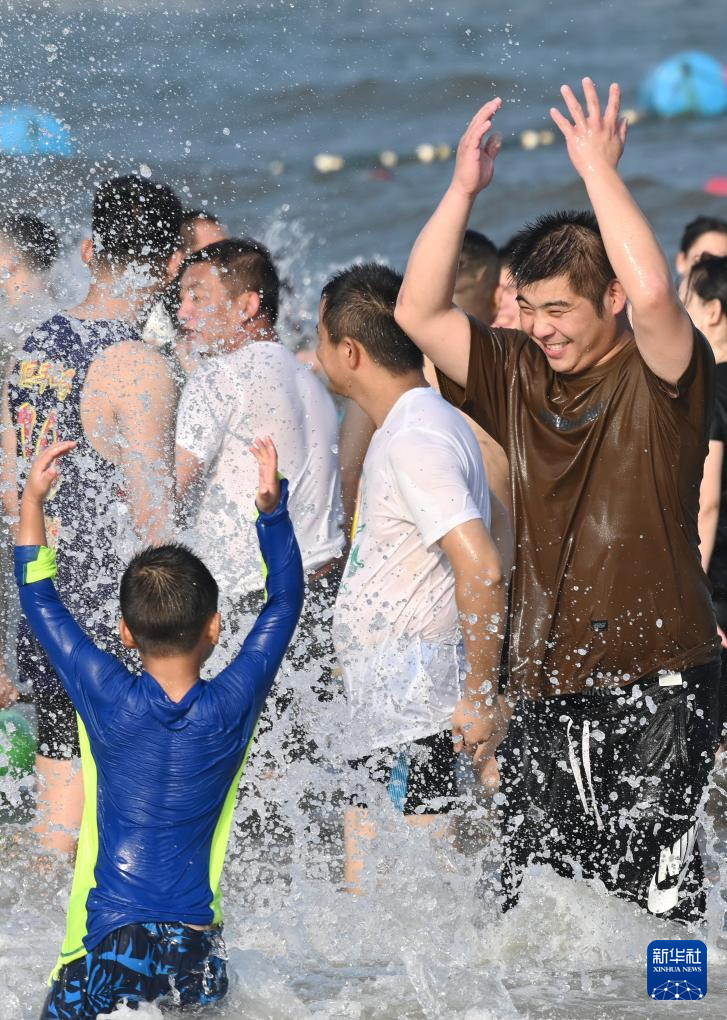 8月2日,游客在秦皇岛市北戴河区东山浴场戏水。