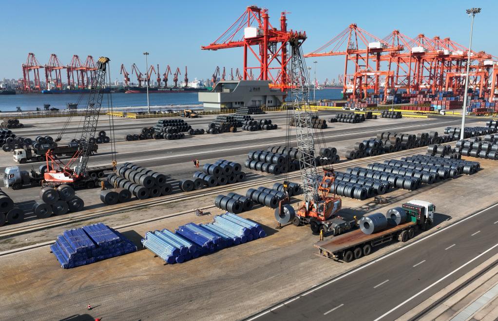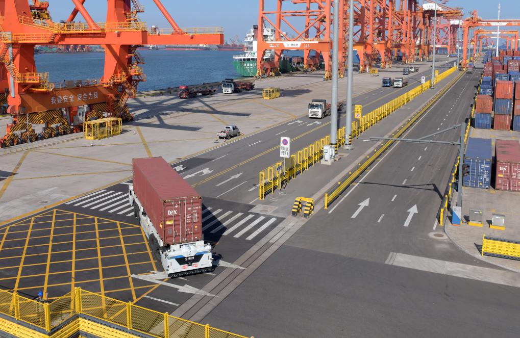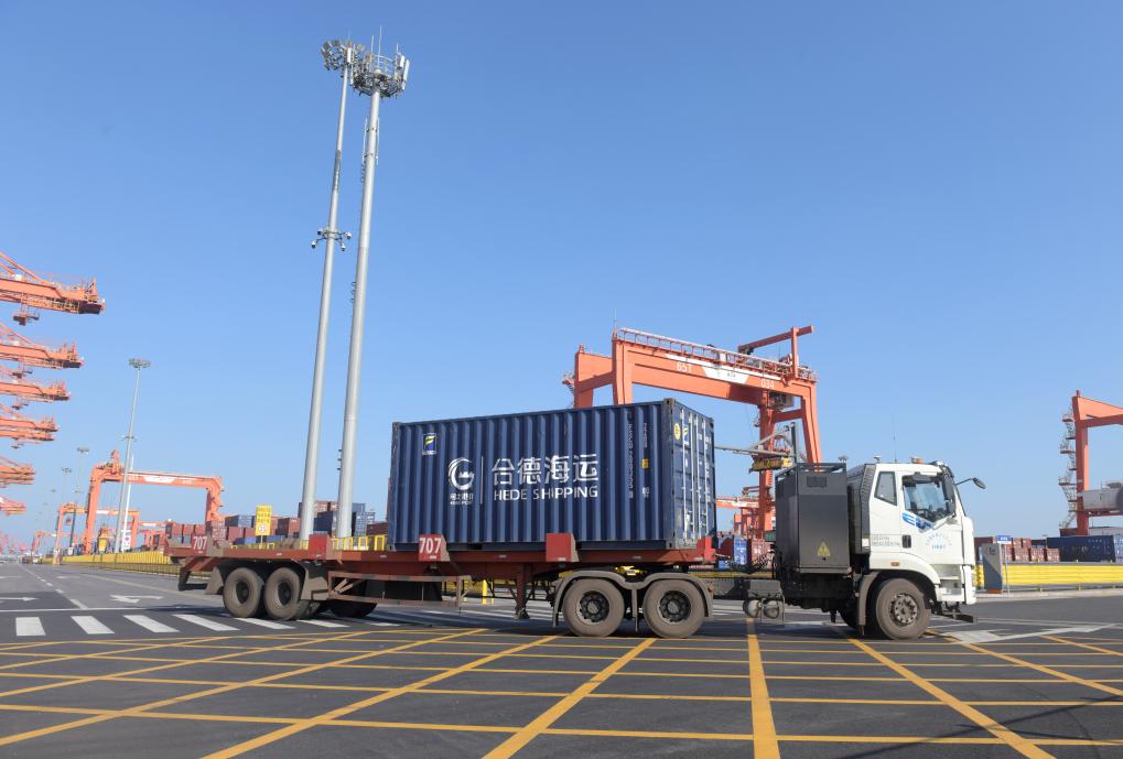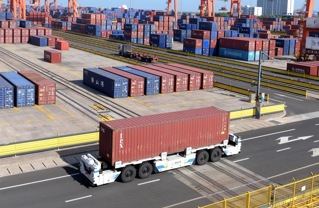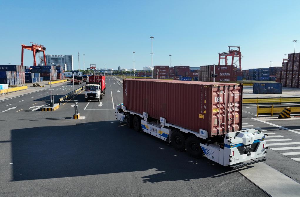 9月23日,一辆智能电动重卡在唐山港京唐港区集装箱码头堆场运送货物。