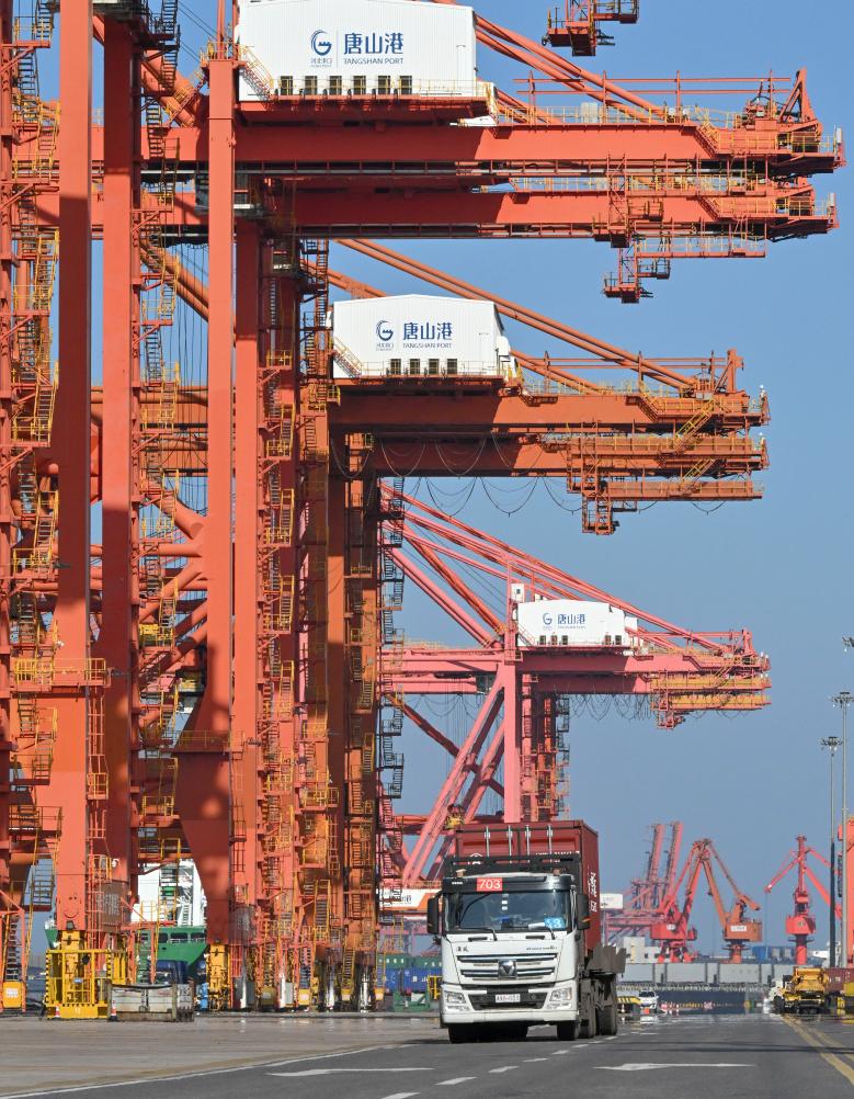 9月23日,一辆电动重卡停在唐山港京唐港区集装箱码头卸载。