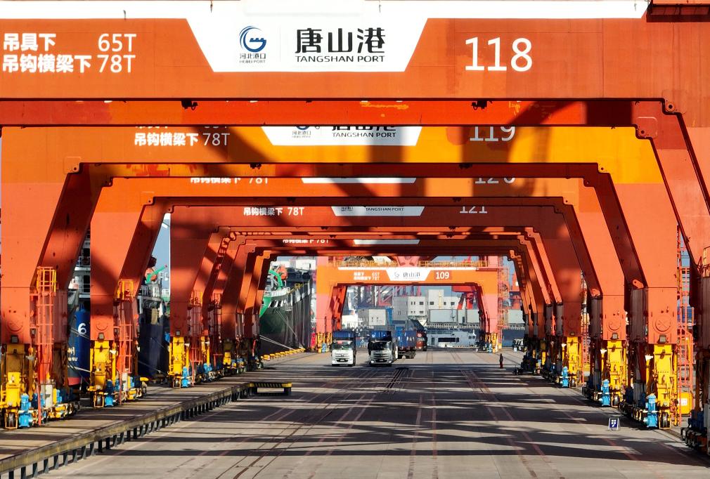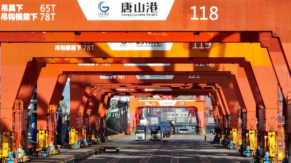 9月23日,多辆电动重卡停在唐山港京唐港区集装箱码头(无人机照片)。