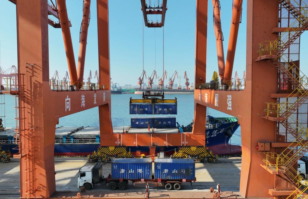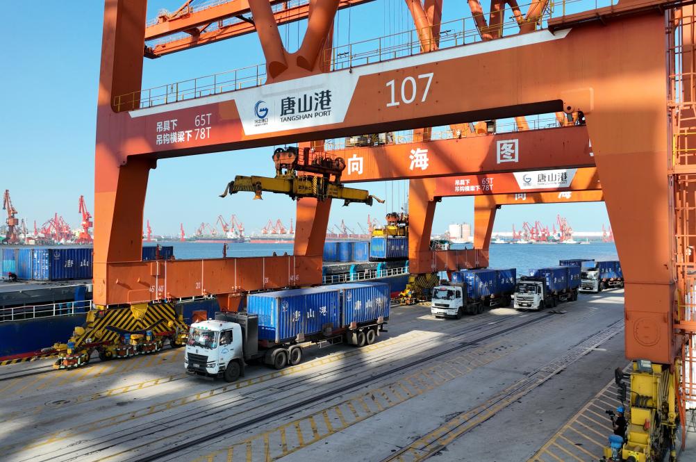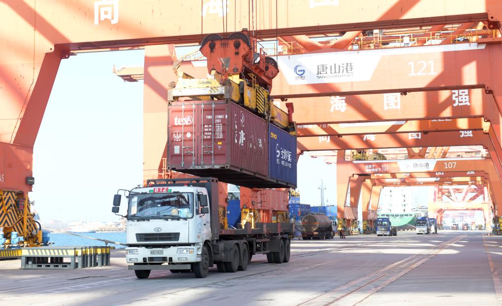 9月23日,一辆电动重卡在唐山港京唐港区集装箱码头运送货物。