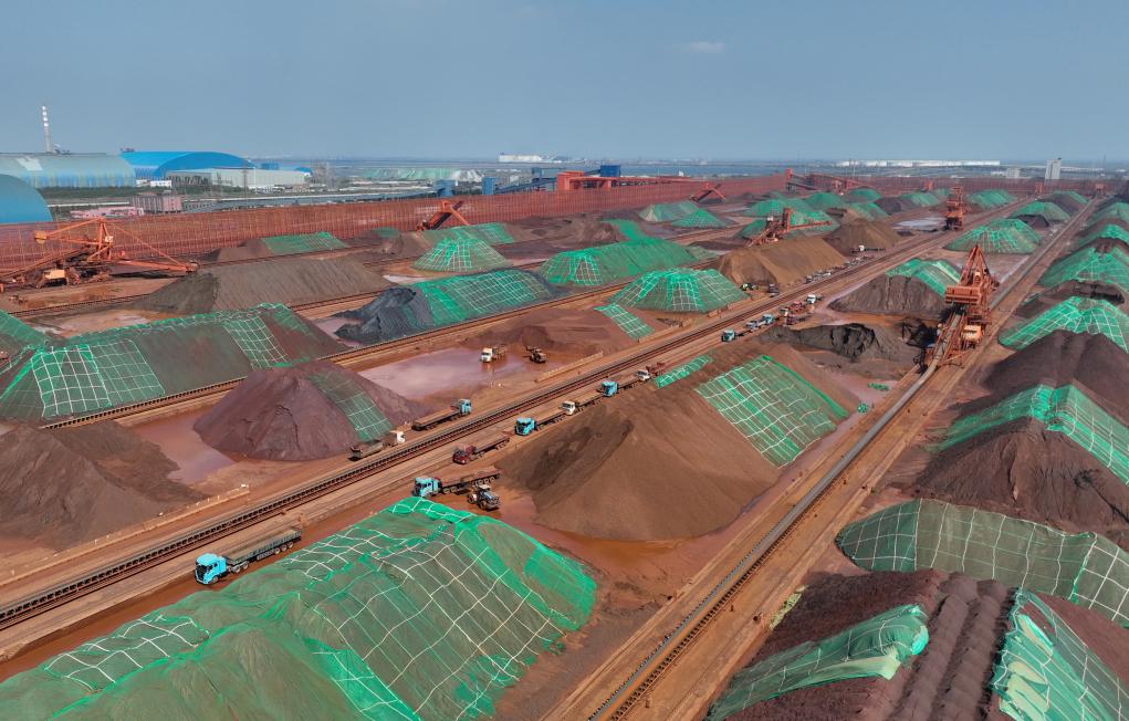 9月24日,多辆电动重卡停在唐山港曹妃甸矿石码头堆场装货(无人机照片)。