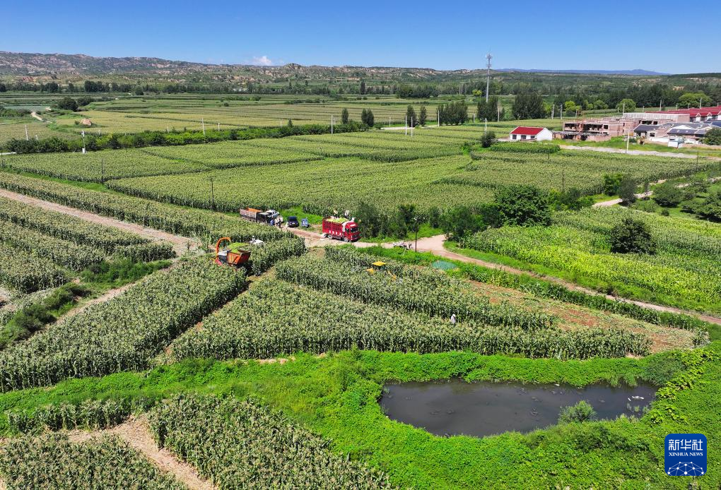 8月13日,在张家口市万全区盆窑村鲜食玉米种植基地,农民收获鲜食玉米(无人机照片)。