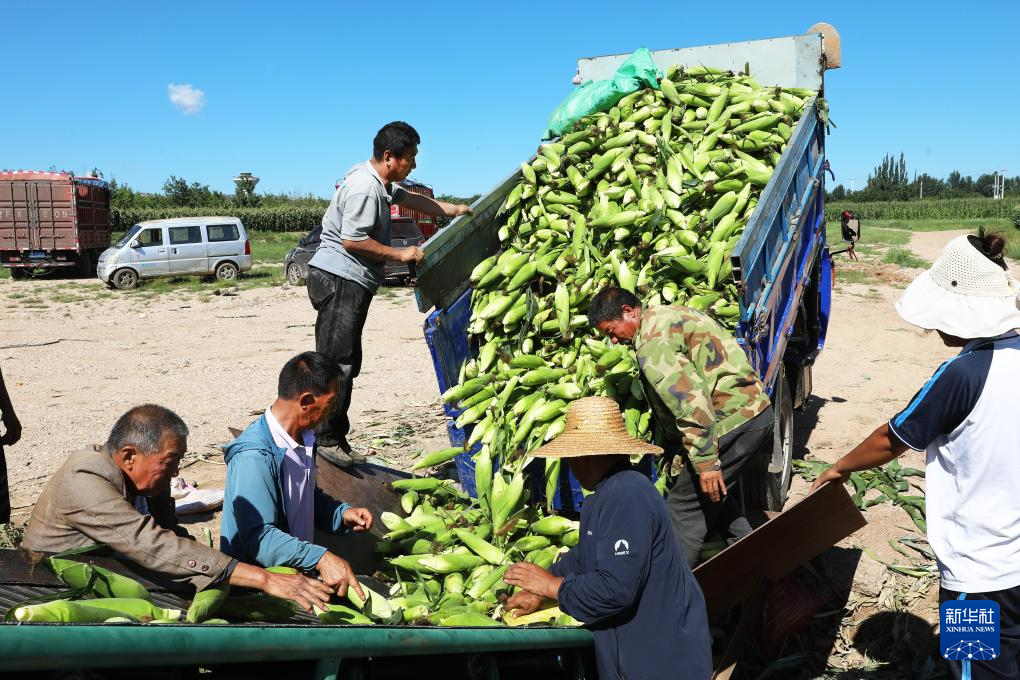 8月13日,在张家口市万全区盆窑村鲜食玉米种植基地,农民将鲜食玉米装车。