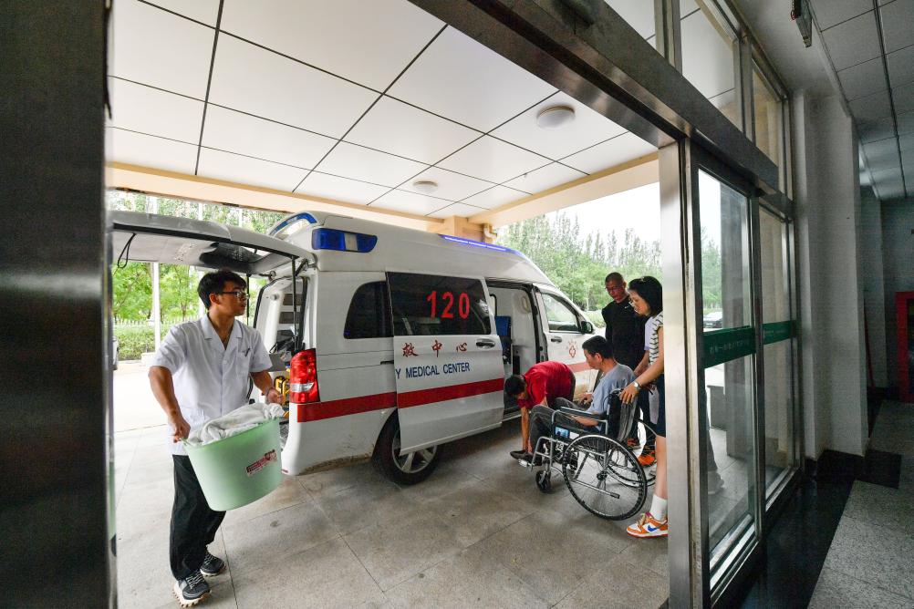8月3日,在天津市静海区海福祥养老护理院,工作人员协助家属将不便转移至临时安置点的群众送至养老护理院。