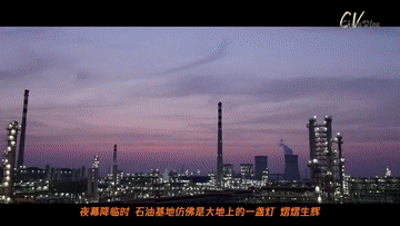 高耸的石油加工设备、纵横的输油管道、璀璨的工厂夜景