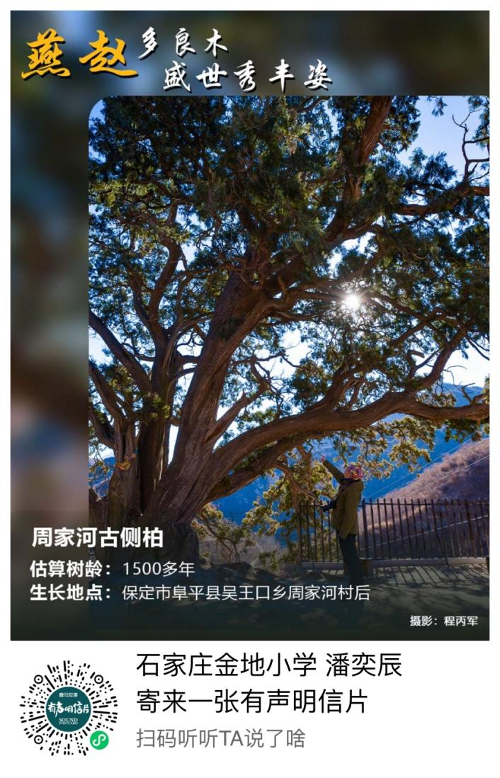 古侧柏位于保定市阜平县吴王口乡周家河村,树高14.6米,胸围7.3米。8根粗壮的枝干,如同8条巨龙盘旋,枝繁叶茂、挺拔苍劲。据估算,它的树龄已超过1500年。枝叶间悬挂着不少红布条和彩色布幡,寄托着人们对幸福生活的憧憬。