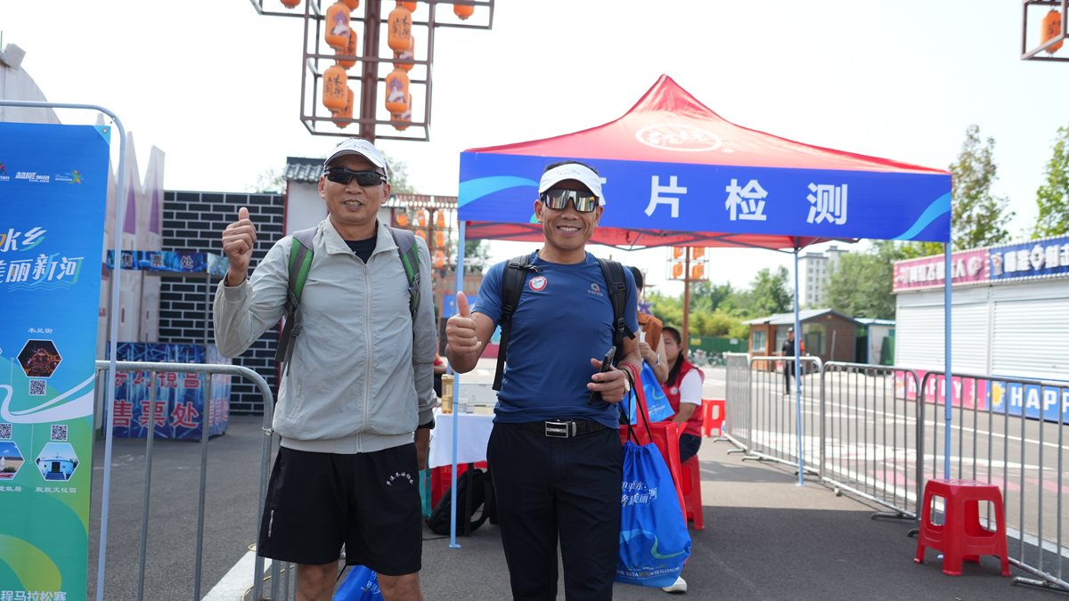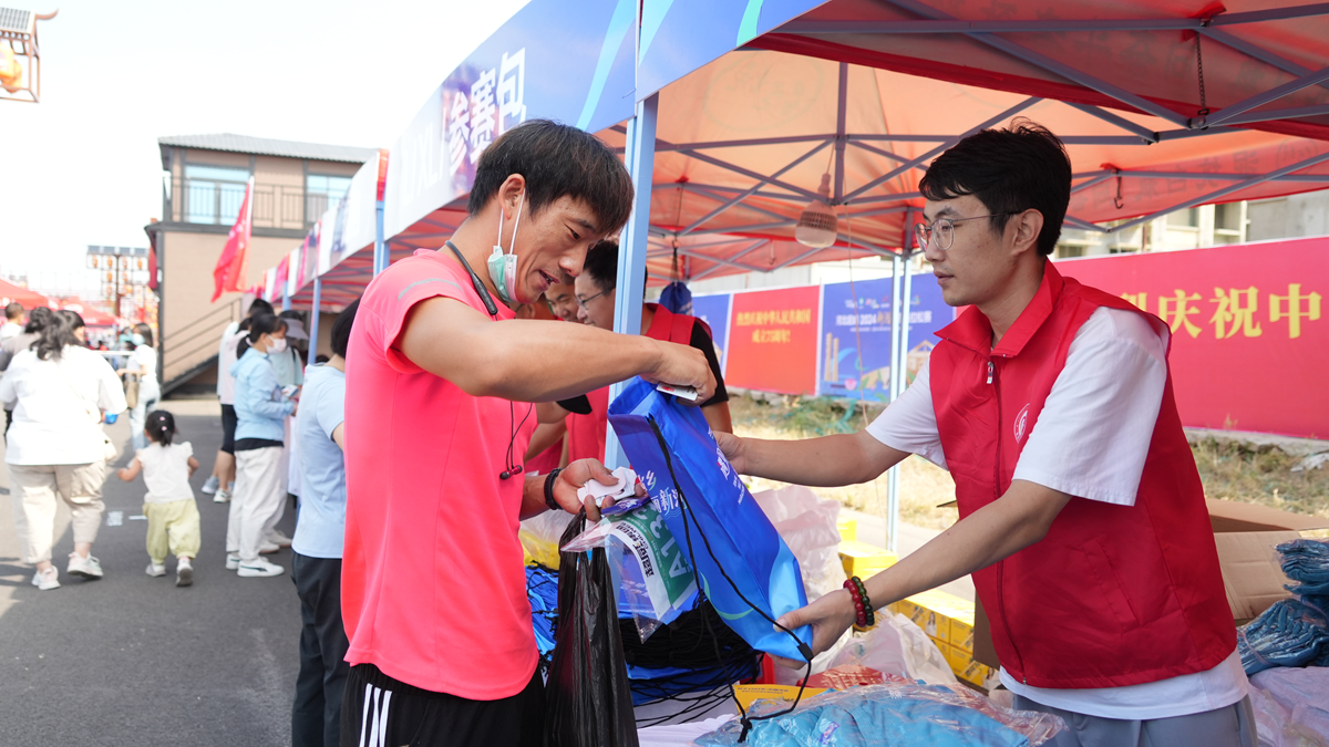 河北超威·2024新河半程马拉松赛将于9月8日上午7点30分在南湖公园鸣枪开跑。9月7日,赛事组委会在木兰街向选手们发放参赛物资。(李世强 新河县融媒体中心供稿)