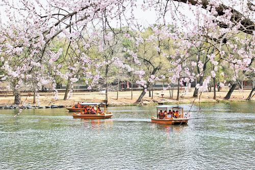 4月4日,游人乘船在承德避暑山庄赏花。新华社发(刘环宇摄)