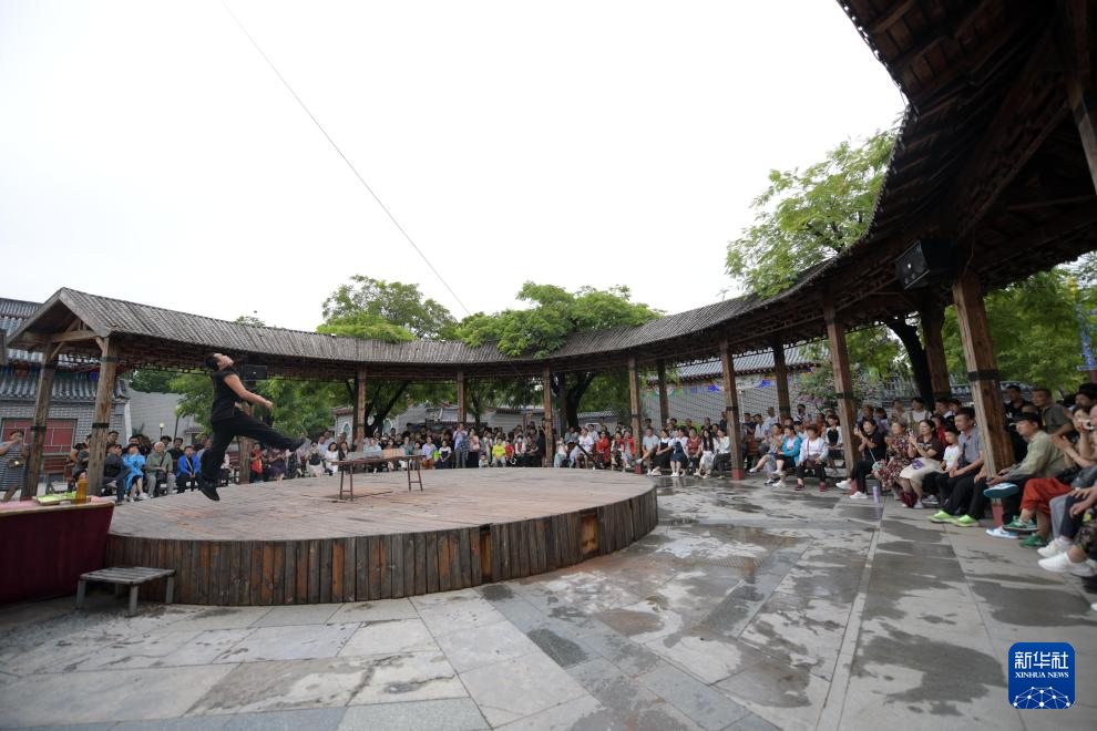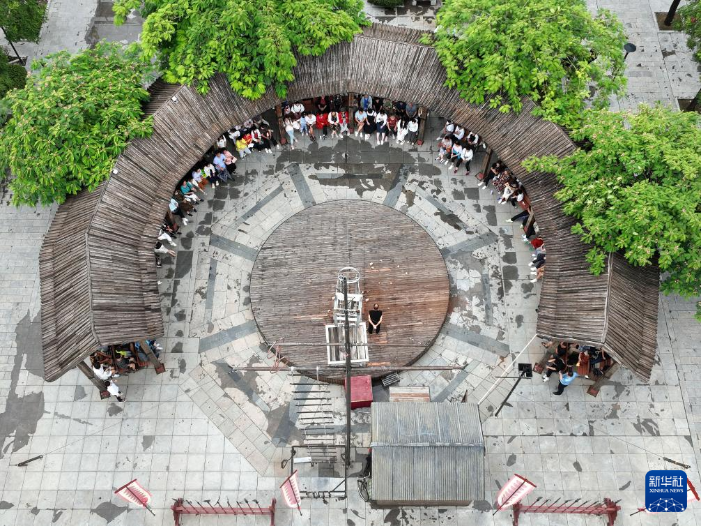 8月12日,在河北省沧州市吴桥杂技大世界景区江湖文化城,游客们观看杂技艺人表演传统杂技节目(无人机照片)。