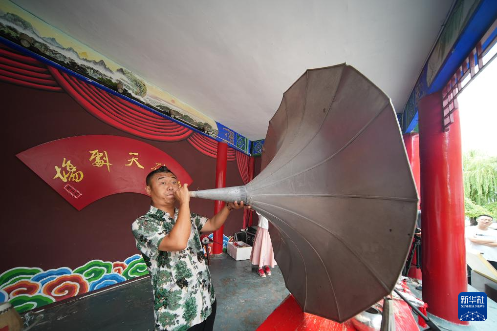 8月12日,在河北省沧州市吴桥杂技大世界景区江湖文化城吹破天剧场,杂技艺人表演吹唢呐。