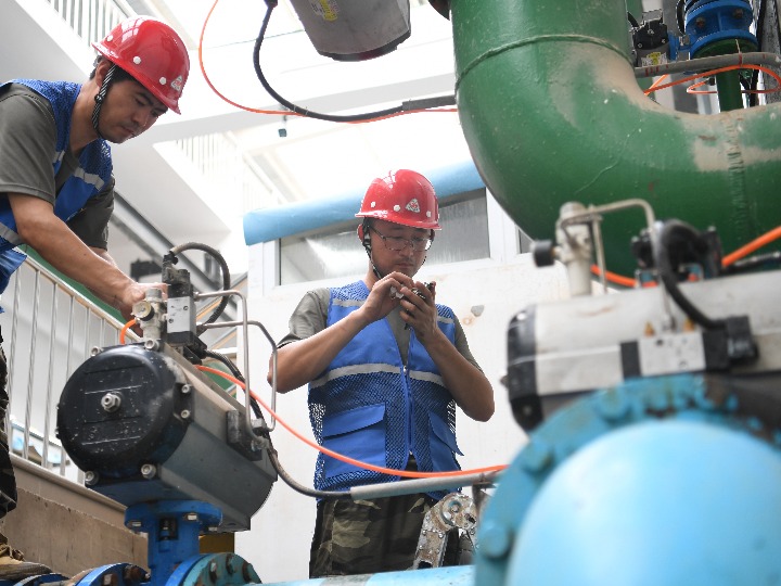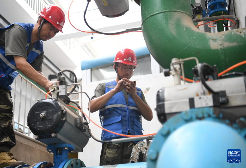 8月8日,工作人员在涿州市城区地表水厂设备间抢修受损设备。新华社记者 朱旭东摄