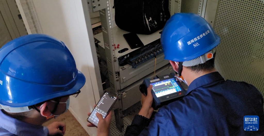 8月8日中午,国网保定供电公司党员突击队成员在涿州110千伏新业变电站检测涉水设备是否正常运行。 新华社记者 苏凯洋 摄