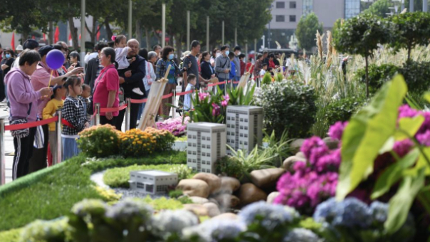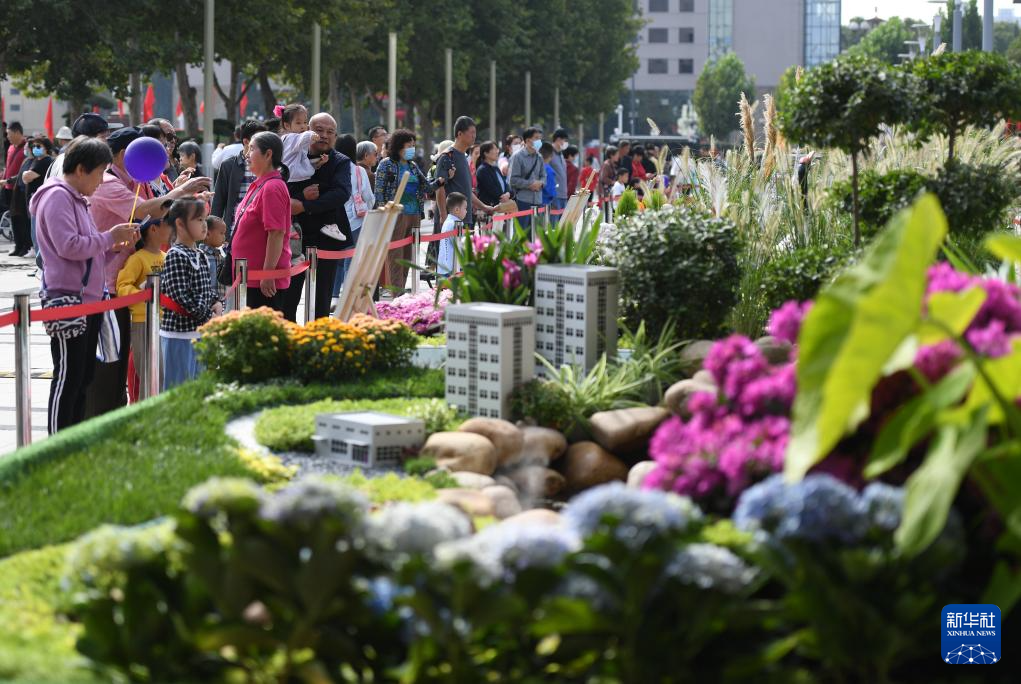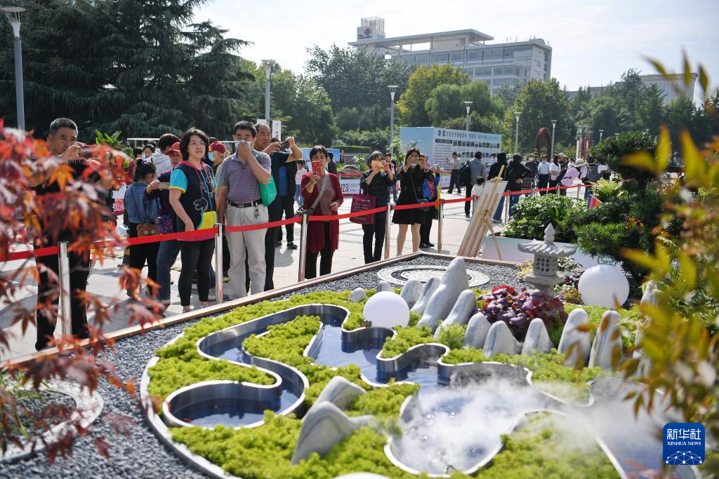 10月2日,市民和游客在石家庄市首届园林“微景观”制作大赛成果展上参观(无人机照片)。