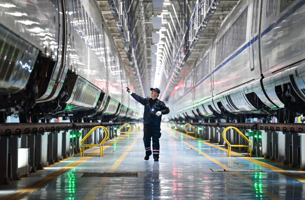 动车机械师站在检修地沟中查看动车底部零件状况。刘向 摄