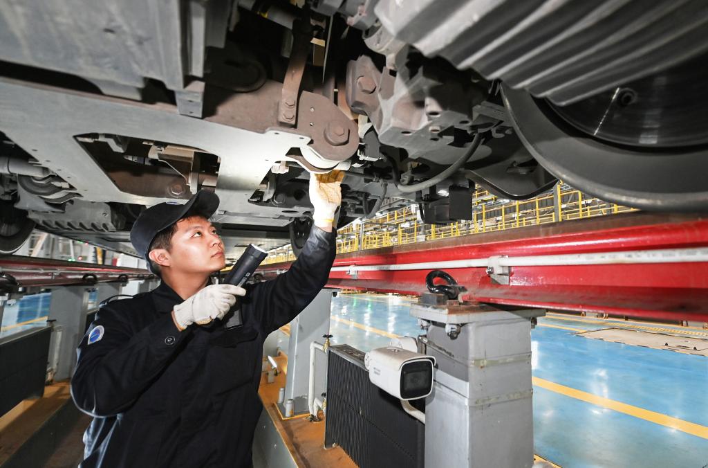 动车机械师孟维浩对“和谐号”动车进行检修。刘向 摄