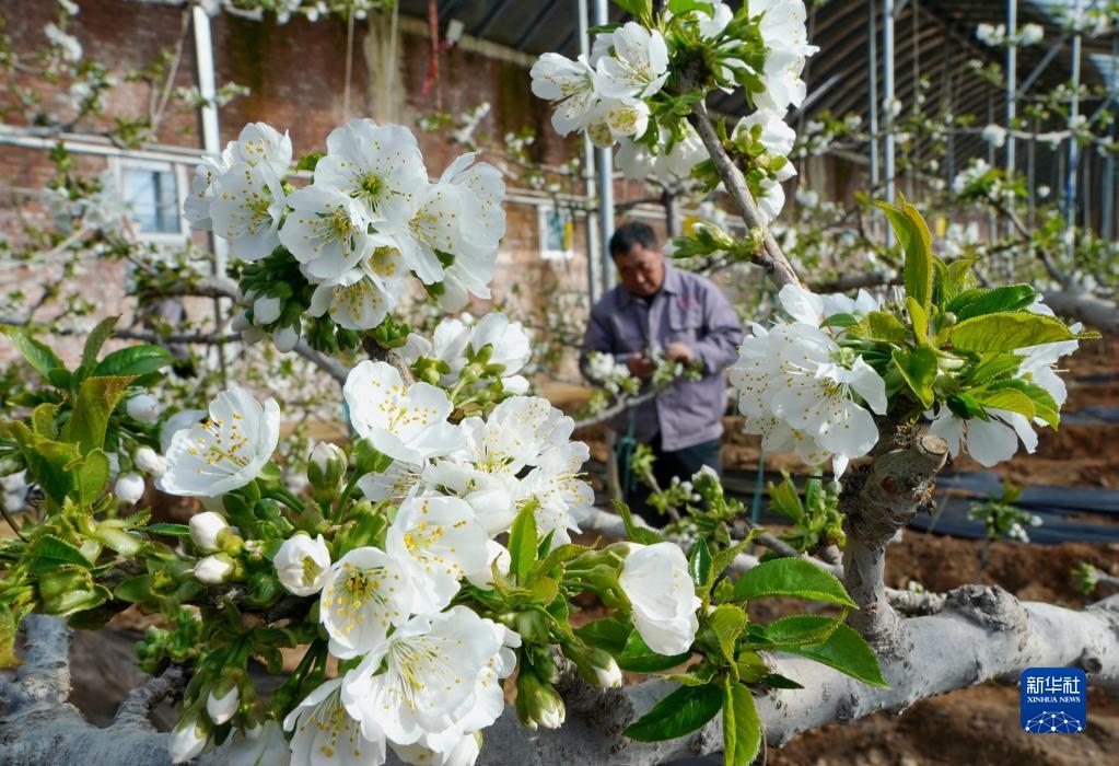 2月1日,秦皇岛市抚宁区榆关镇一家樱桃种植合作社的社员在大棚内管护樱桃树。