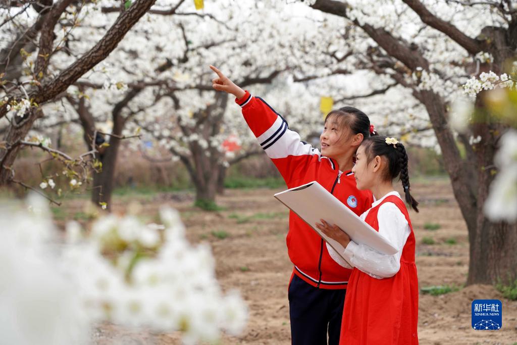 4月2日,小朋友在临城县北程村百年梨园写生。