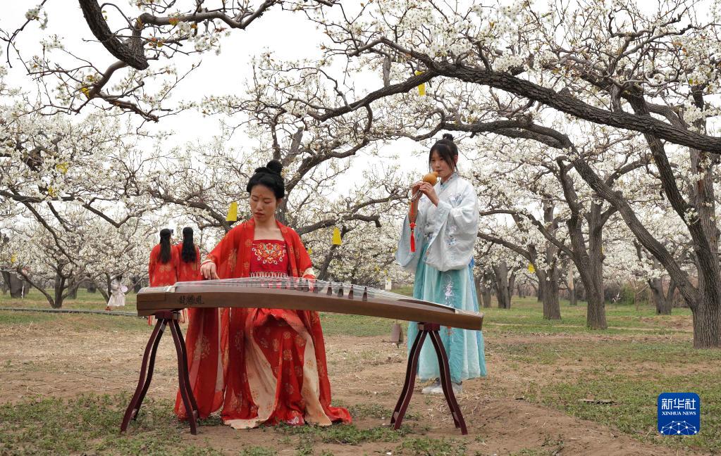 4月2日,在临城县北程村百年梨园举行的梨花节主题活动上,音乐爱好者演奏乐器。