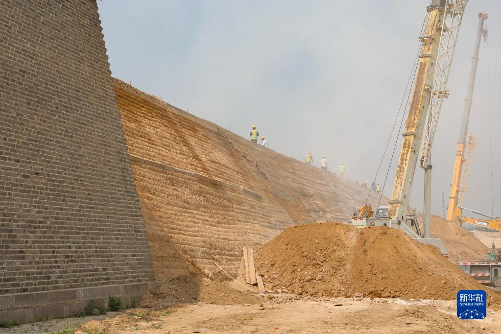 8月3日,工人在万全卫城进行城墙修缮作业。