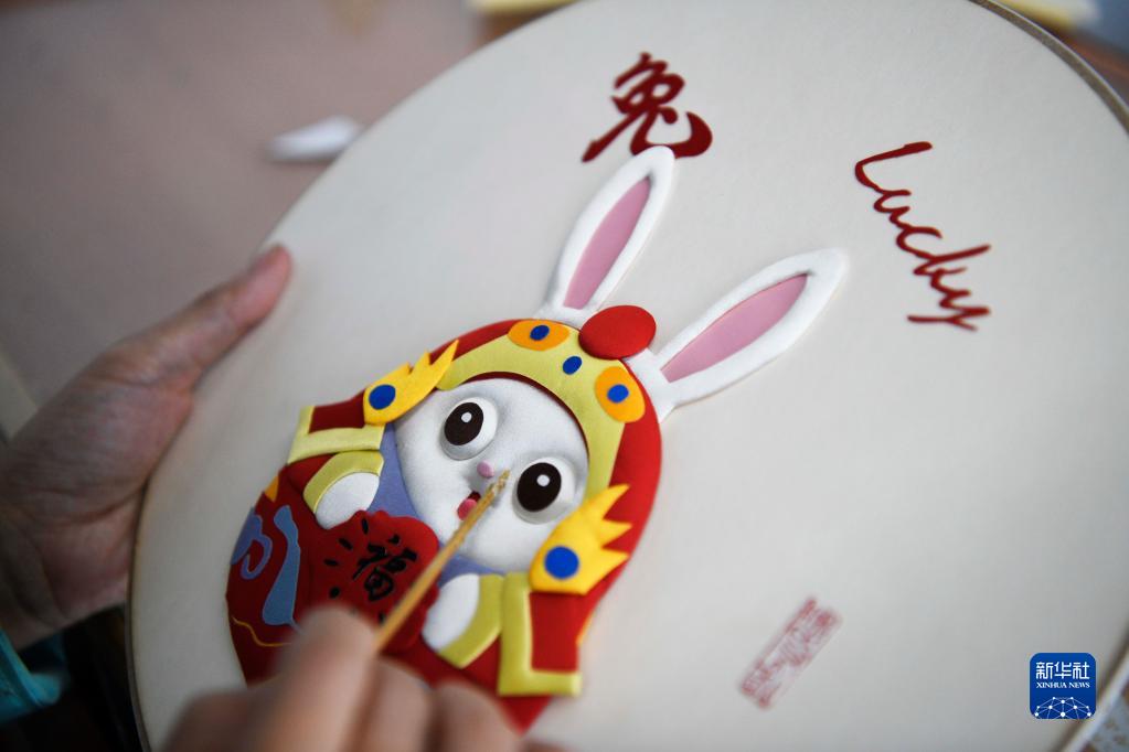 腊月里,河北省丰宁满族自治县布糊画手工艺人以兔为主题,制作憨态可掬、萌味十足的兔年主题布糊画,喜迎新春佳节。布糊画是国家级非物质文化遗产,以绫罗绸缎等面料为主,在满族传统工艺“补花”的基础上,取绘画、浮雕、堆绣、剪纸、裱糊、布贴画等传统工艺精华结为一体,呈现出浮雕立体的效果。新华社发(王立群 摄)