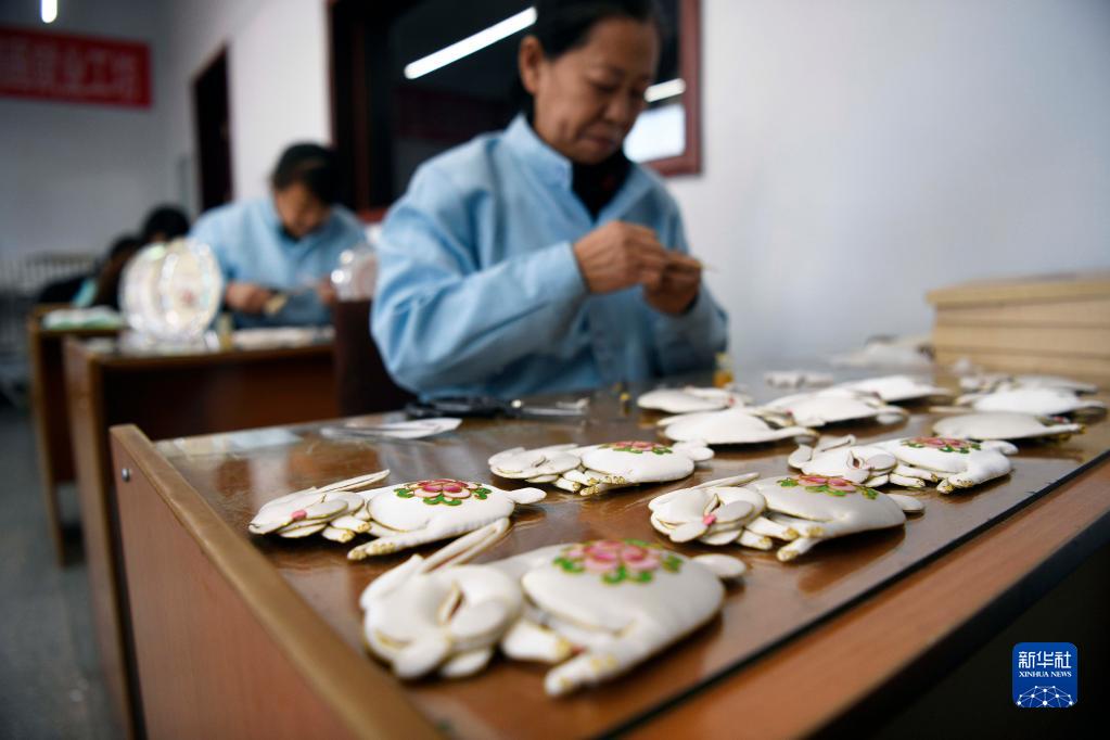 1月4日,在丰宁县非遗布糊画就业工坊,手工艺人在制作兔年主题布糊画。