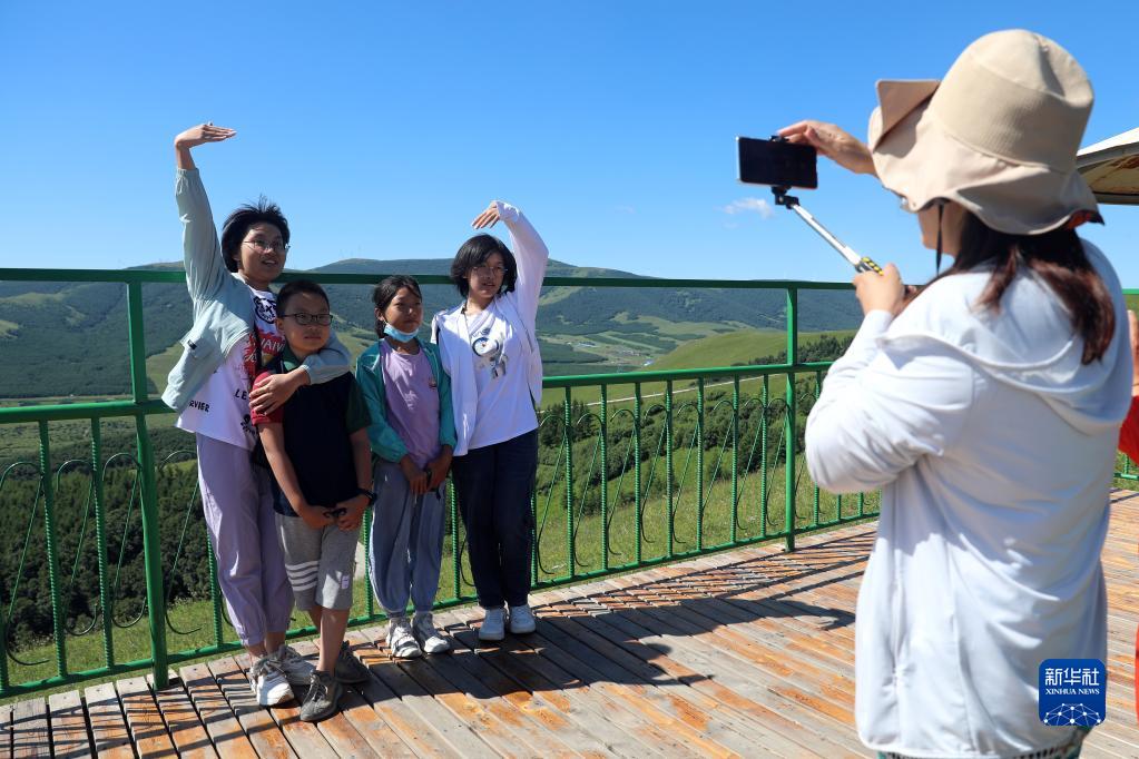 8月5日,游客在丰宁满族自治县千松坝森林公园景区拍照游玩。