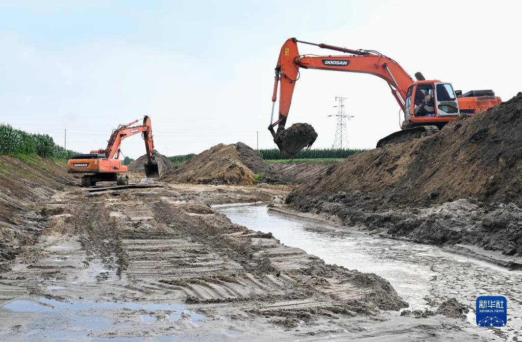 8月5日,工人在昌黎县新集镇境内的引滦河水灌渠清淤现场施工。