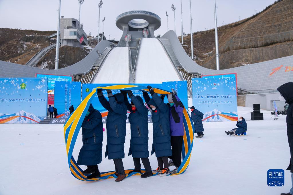 1月6日,现场嘉宾在启动活动上体验“车轮滚滚”雪地趣味运动。新华社记者 才扬 摄