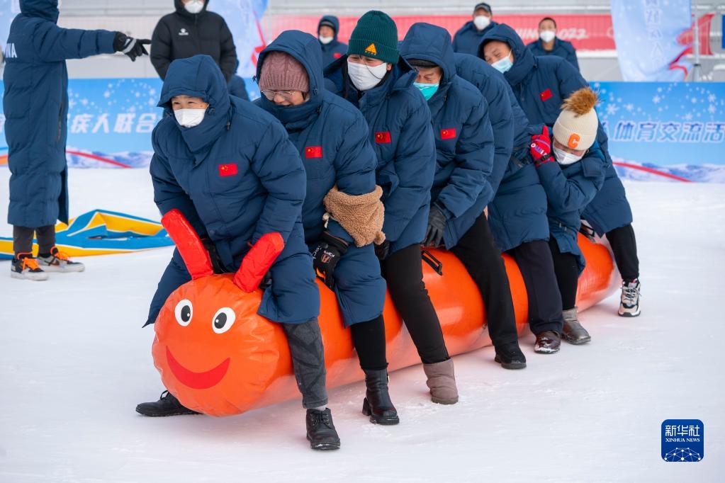 1月6日,现场嘉宾在启动活动上体验“雪地毛毛虫”趣味运动。新华社记者 才扬 摄
