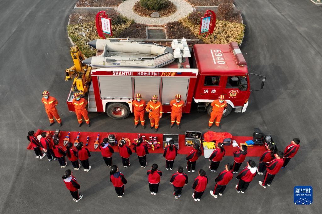 2月6日,在隆尧县第二实验小学,消防员向学生介绍消防救援设备(无人机照片)。