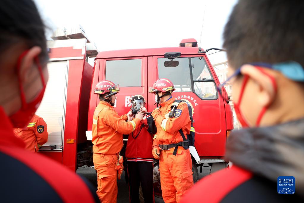 2月6日,在隆尧县第二实验小学,学生在消防员指导下体验正压式空气呼吸器。