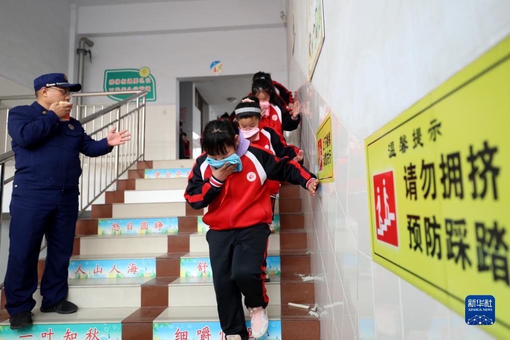 2月6日,在隆尧县第二实验小学,学生进行火灾逃生演练。