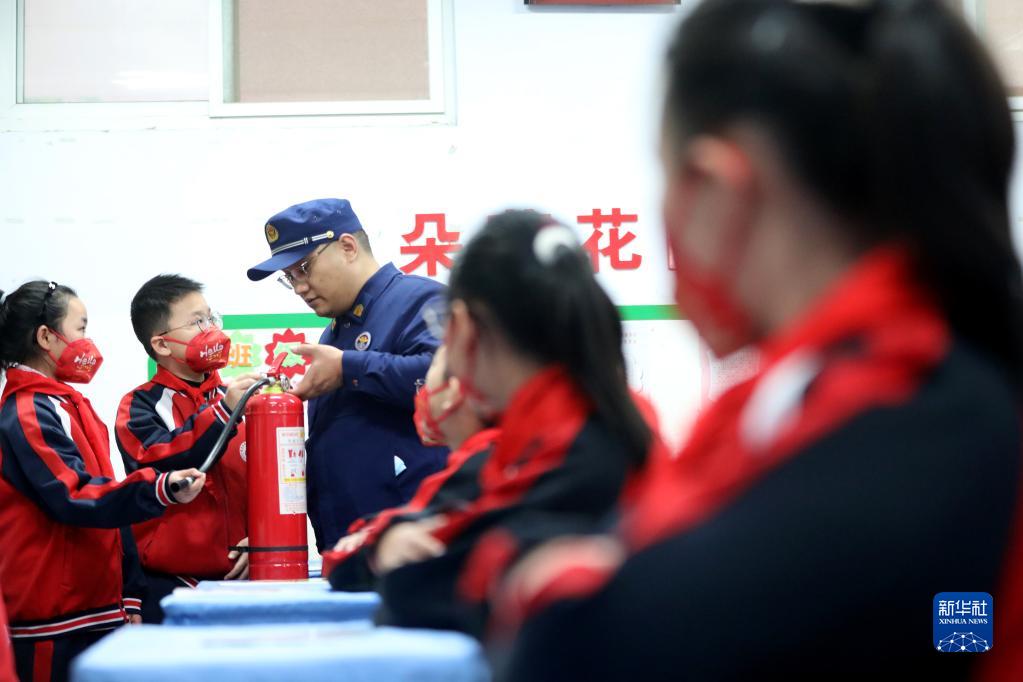 2月6日,在隆尧县第二实验小学,学生在消防救援人员指导下学习使用干粉灭火器。