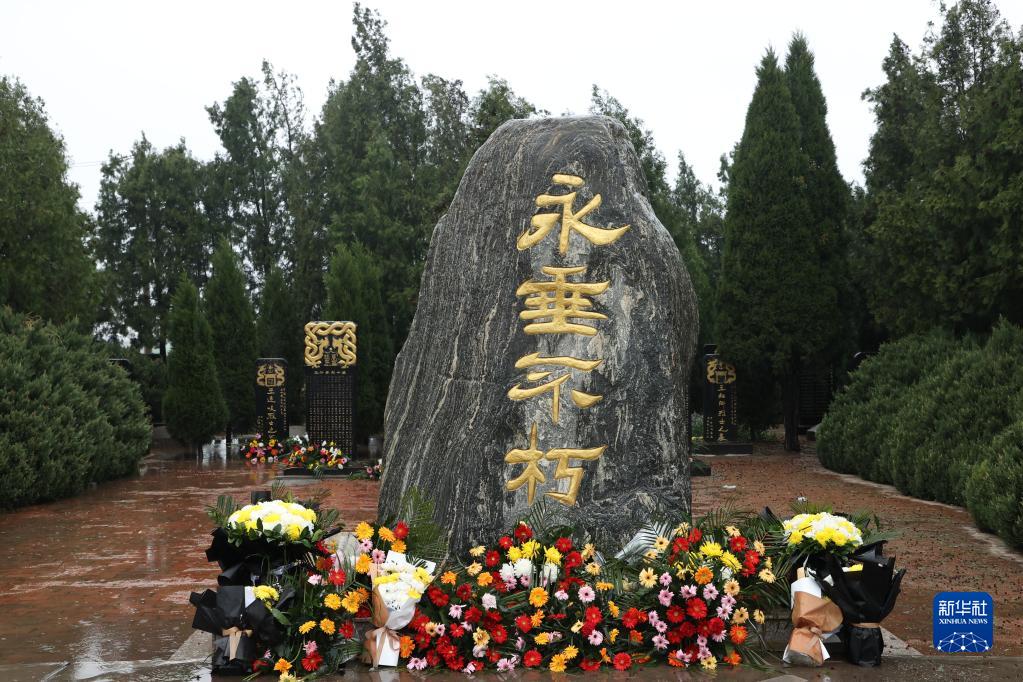 清明时节,河北海兴县小山乡曹庄子村烈士陵园纪念碑前摆放着鲜花。新华社记者王民 摄