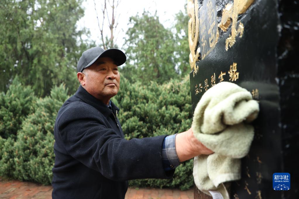 4月4日,张连胜在烈士陵园擦拭“海兴县烈士铭”纪念碑。新华社记者王民 摄