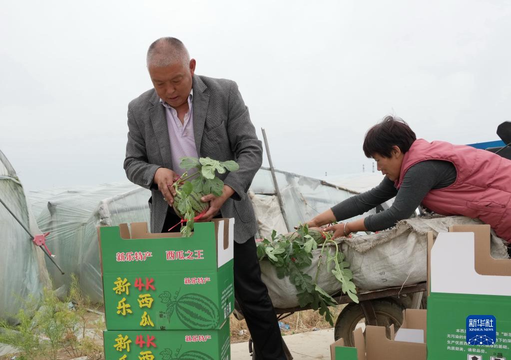 5月6日,河北省新乐市邯邰镇小流村国峰西瓜合作社的社员将采摘的西瓜装箱。