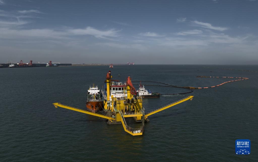 10月8日,施工船在唐山港京唐港区第四港池25万吨级航道工程建设工地施工(无人机照片)。