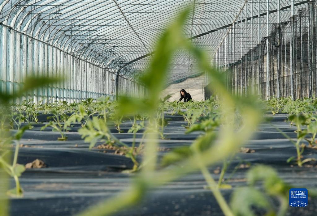2月7日,河北省滦州市滦城街道杨家院村的农民在大棚内管护西瓜秧苗。