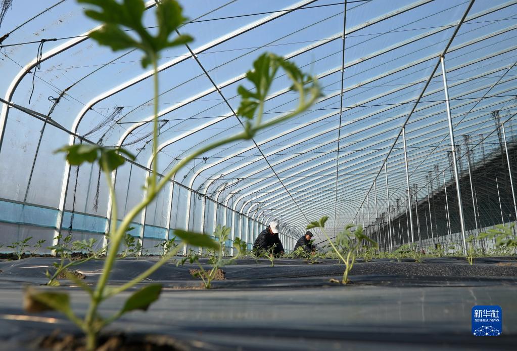 2月7日,河北省滦州市滦城街道杨家院村的农民在大棚内管护西瓜秧苗。