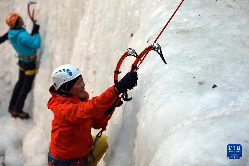 近日,河北邢台市云梦山景区内的七叠瀑形成壮观冰壁,吸引不少游客前来游玩。攀冰爱好者借助专业工具,在专职教练的指导下体验攀冰,成为太行山冬日里一道别样风景。